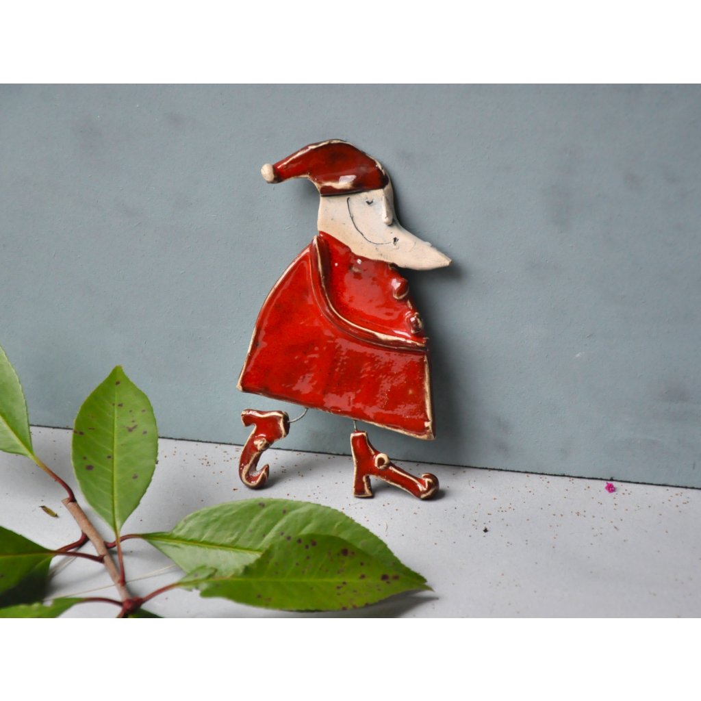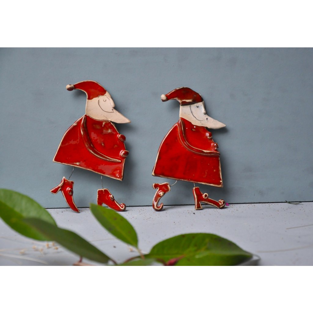 Tento fešák s poriadnym bruchom prichádza rozdať radosť – a možno aj pár sladkostí (ak mu ich predtým všetky nezmiznú z vrecka 😄). Je celý ručne vyrobený s láskou a kreativitou, od špičky čiapky až po ručne tvarované čižmičky, ktoré hrdo kráčajú dopredu akoby už počuli šuchot detských topánok pri dverách. Zo zadnej strany má malý kovový háčik na zavesenie, takže ho môžete ľahko umiestniť na stromček, dvere, poličku či stenu – jednoducho kamkoľvek, kde má zavítať sviatočný duch.