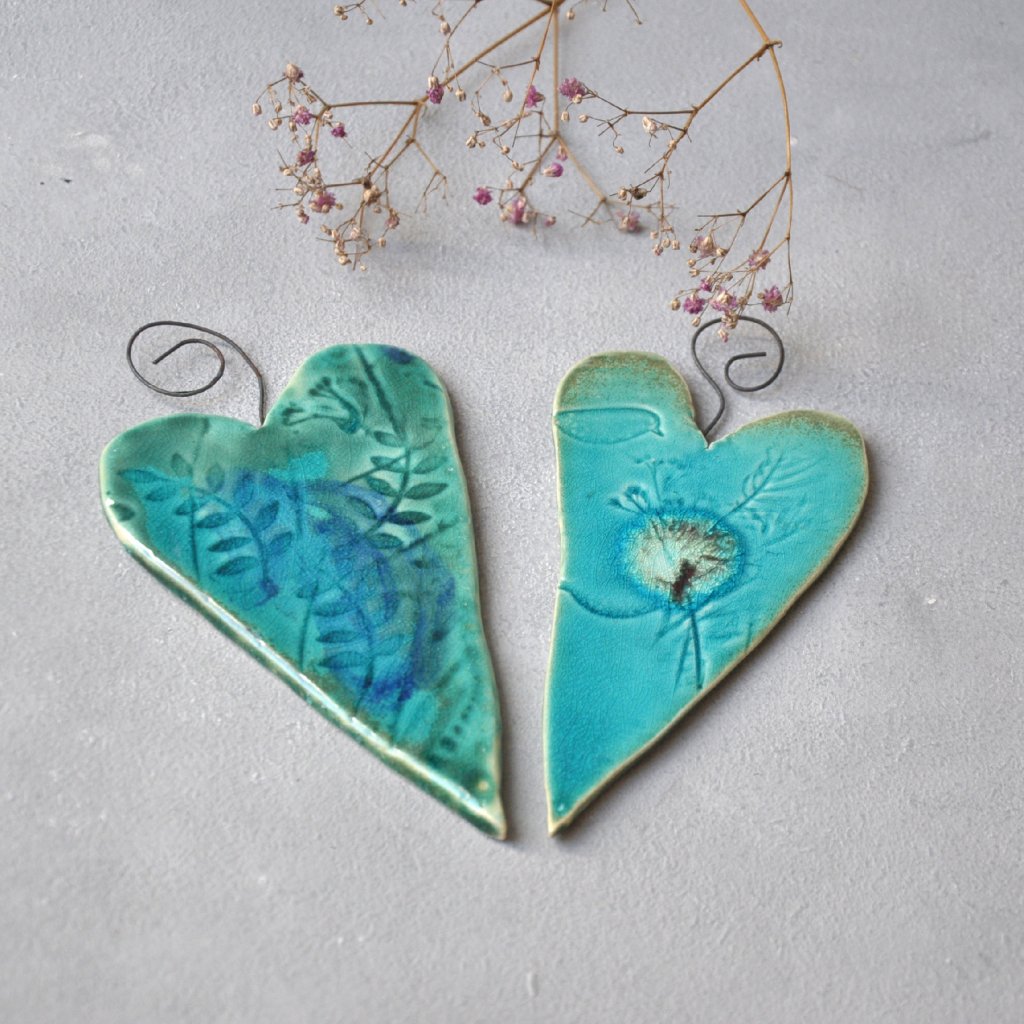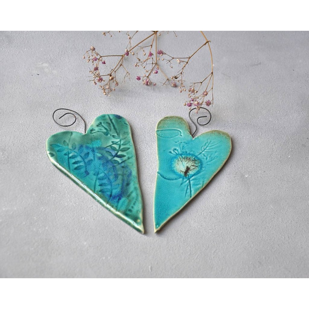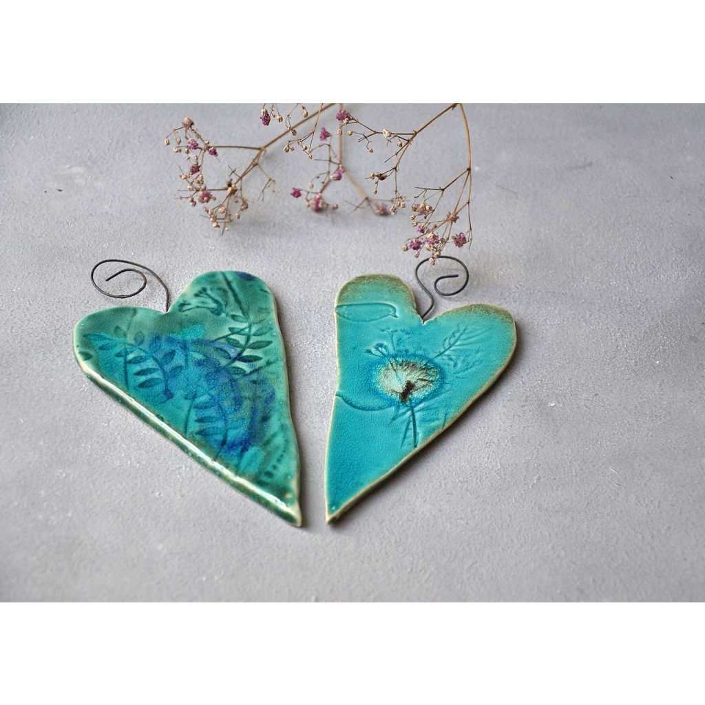 Tyrkysové keramické srdiečko je umelecký kúsok, ktorý v sebe spája jemnosť ručnej práce a hĺbku prírodnej krásy. Modelované z hliny, ručne glazované priehľadnou tyrkysovou glazúrou, cez ktorú prenikajú jemné motívy prírody, pôsobí nežne a jedinečne. Každý kúsok je originálom – nikdy nevzniknú dve rovnaké srdiečka.