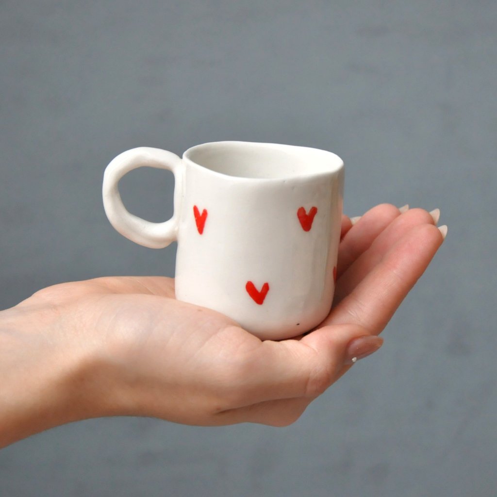 💗 Doprajte si chvíľku pokoja s výnimočnou šálkou na presso. Biela glazúra je posiata červenými srdiečkami, a každé srdiečko je pozorne maľované ručne – ako jemné dotyky vašej lásky ☕❤️