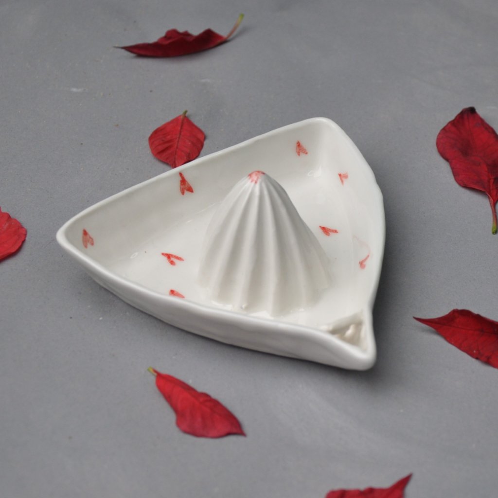 Tento ručne vyrábaný porcelánový odšťavovač je malý každodenný rituál radosti. Minimalistický tvar dopĺňa jemná glazúra s malými ručne malovanými červenými srdiečkami, ktoré do kuchyne vnášajú teplo, nehu a pocit domova. Každý kus je originál – vytvorený pomaly, s citom a dôrazom na detail.