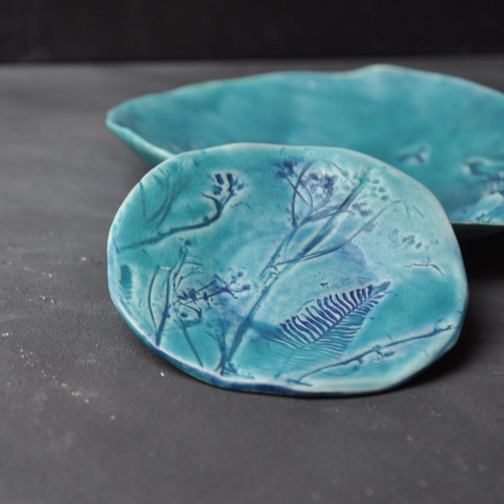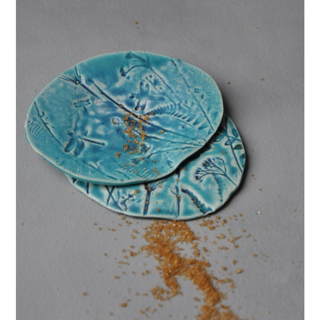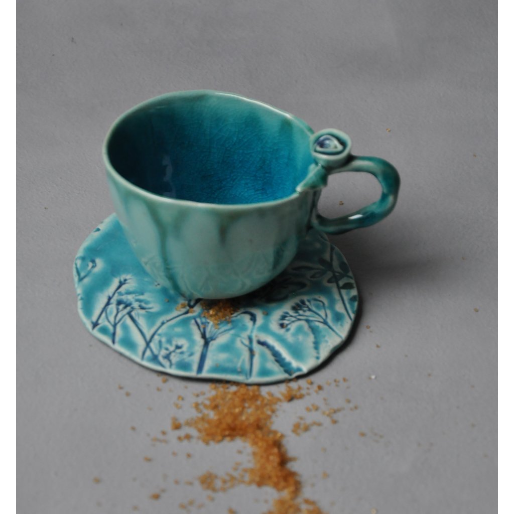 Tyrkysová ako ranná rosa na listoch, ako rieka vinúca sa krajinou ticha – táto ručne vyrábaná keramická podšálka v sebe nesie pokoj prírody a krásu ručného remesla. Jemný prírodný motív na jej povrchu pripomína samotný život – každý kúsok tak dýcha vlastným príbehom.